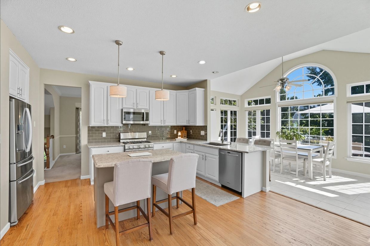 The updated kitchen opens to the family room and the casual dining room with large windows and access to the backyard.